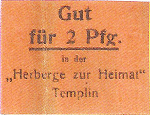 2 Pfennig; o. J.; Lindmann T003; Vs.: Gut / für 2 Pfg. / in der / "Herberge zur Heimat" / Templin; Rs.: leer; Farbe: Ziegelrot |
