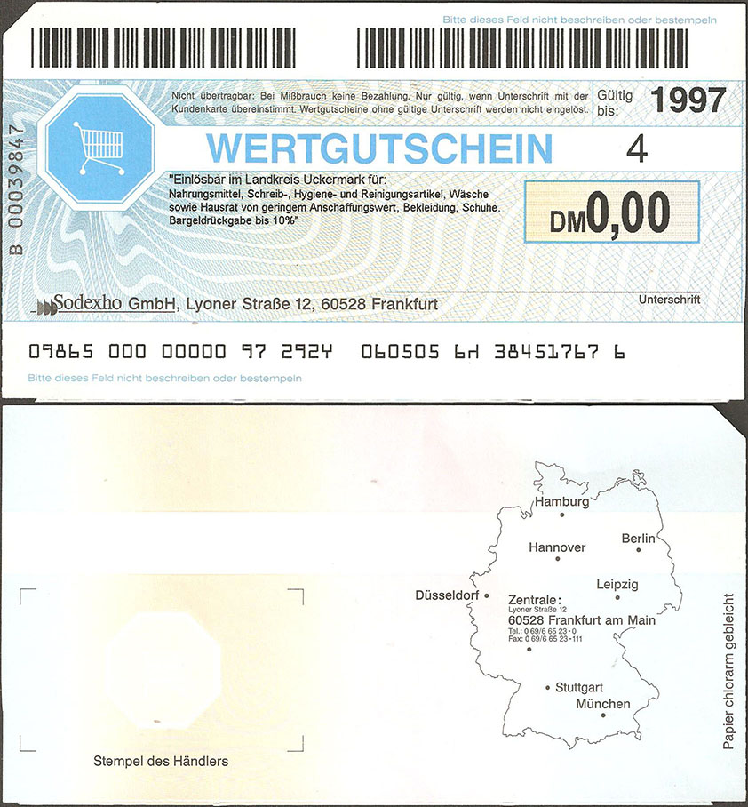 o. W.; 1997; KZ 8-stellig mit "B" davor; nicht katalogisiert; Vs.: WERGUTSCHEIN 4, einlösbar in der Uckermark...; Rs.: Umris der BRD, Stempel des Händlers; Papier chlorarm gebleicht |