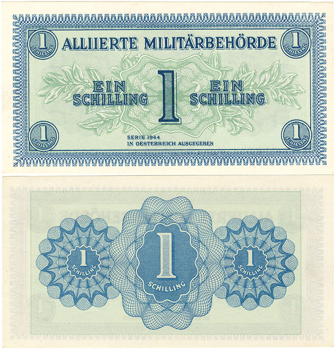 1 Schilling; 1944; Pick 103a; ohne KN; Vs.: Ornamente und Wertangebe; Rs.: Ornamente und Rahmen; Wz.: "Military Authority" oder ohne Wz.; erst im Mai 1945 ausgegeben; US-Druck |