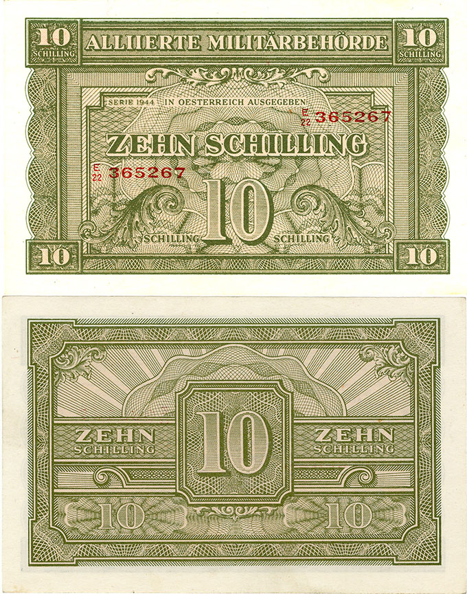 10 Schilling; 1944; Pick 106; KN 6-stellig; Vs.: Ornamente und Wertangebe; Rs.: Ornamente und Rahmen; Wz.: Wellenlinien; erst im Mai 1945 ausgegeben; US-Druck |