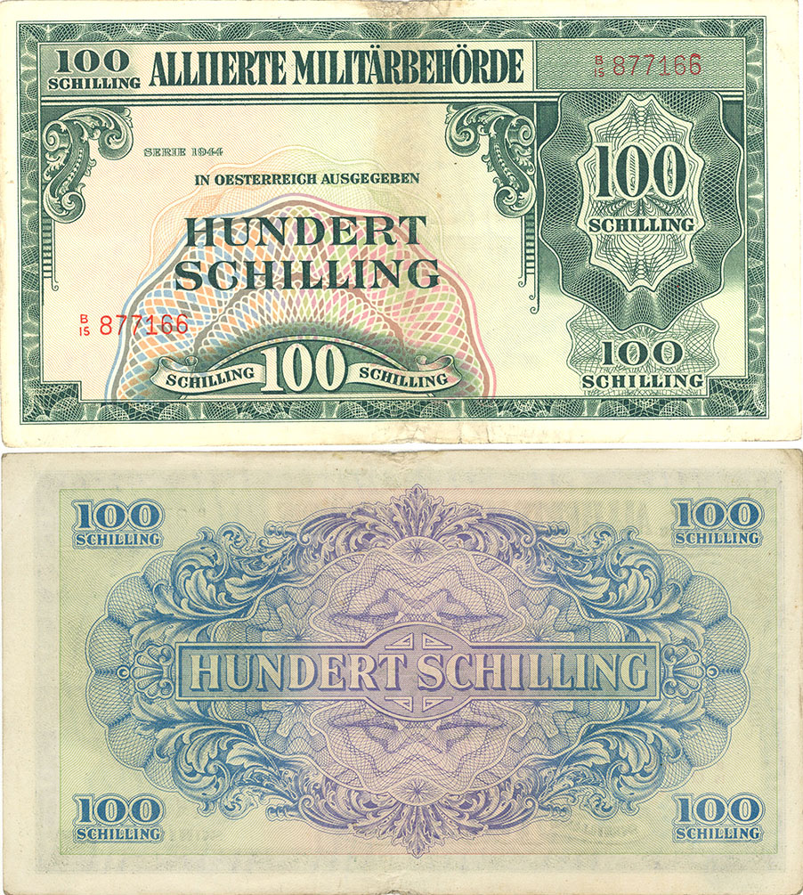 100 Schilling; 1944; Pick 110; KN 6-stellig; Vs.: Ornamente und Wertangebe; Rs.: Ornamente und Rahmen; Wz.: Wellenlinien; erst im Mai 1945 ausgegeben; US-Druck |