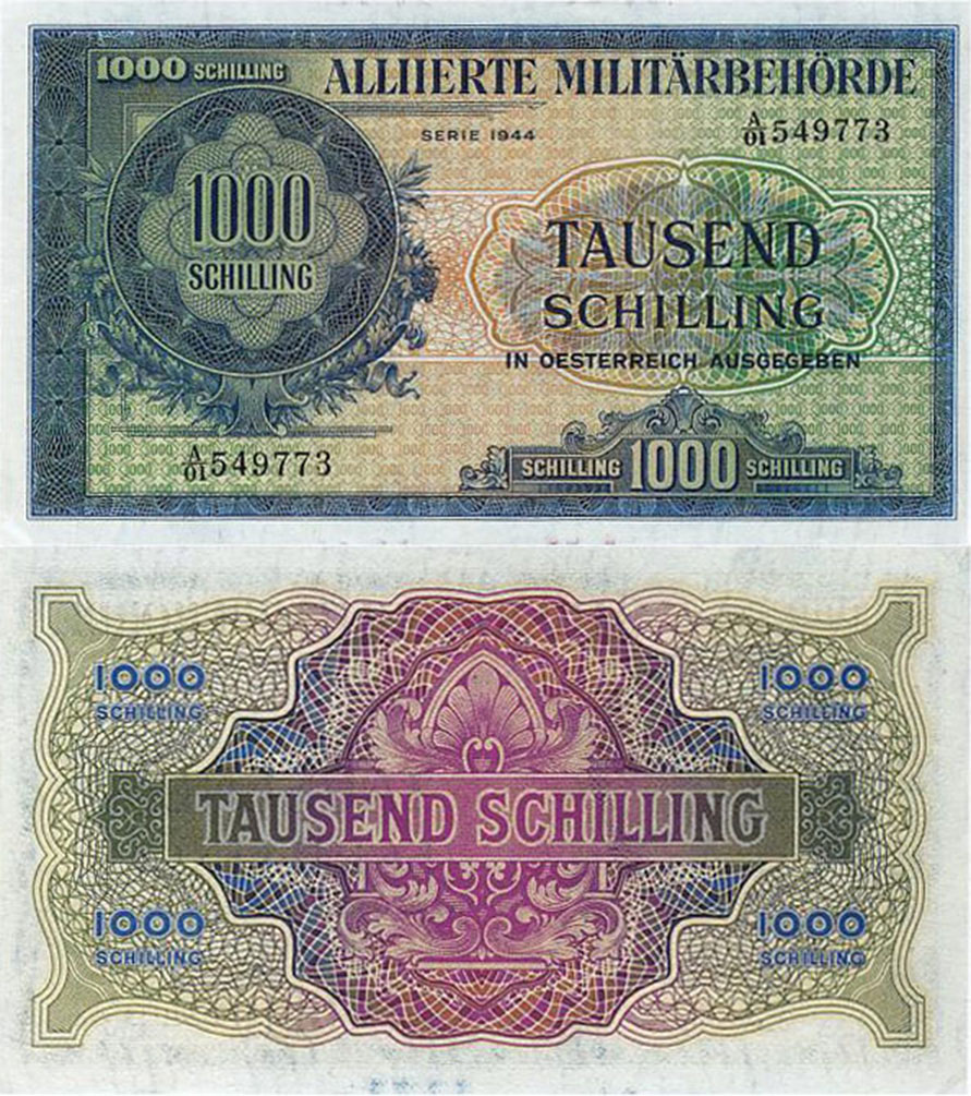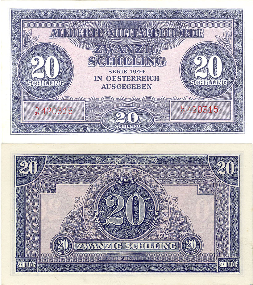 Das Bureau of Engraving and Printing druckte den 25-Schilling-Schein, Forbes 50 Groschen sowie 1 und 2 Schilling. Alle Werte mit Ausnahme des 25-Schilling-Scheins wurden in England gedruckt. Quellen: Papiergeld Lexikon, Albert Pick, Mosaik Verlag GmbH München/54321, 1978, ISBN 3-570-05022-x | |