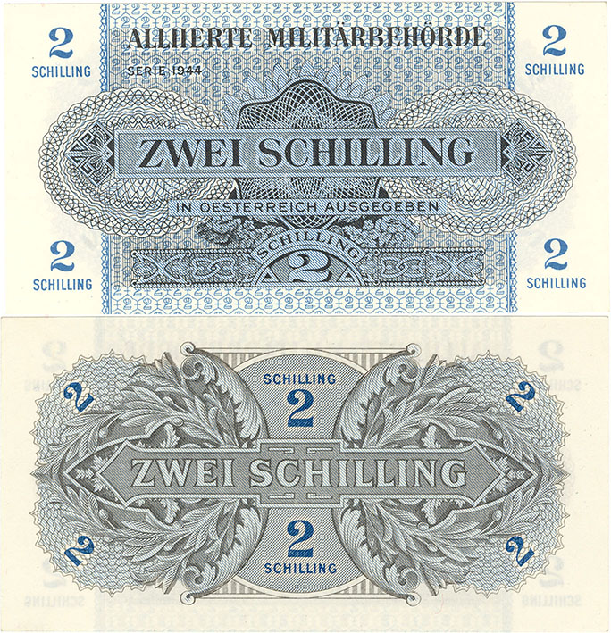 2 Schilling; 1944; Pick 104a; ohne KN; Vs.: Ornamente und Wertangebe; Rs.: Ornamente und Rahmen; Wz.: "Military Authority" oder ohne Wz.; erst im Mai 1945 ausgegeben; US-Druck |