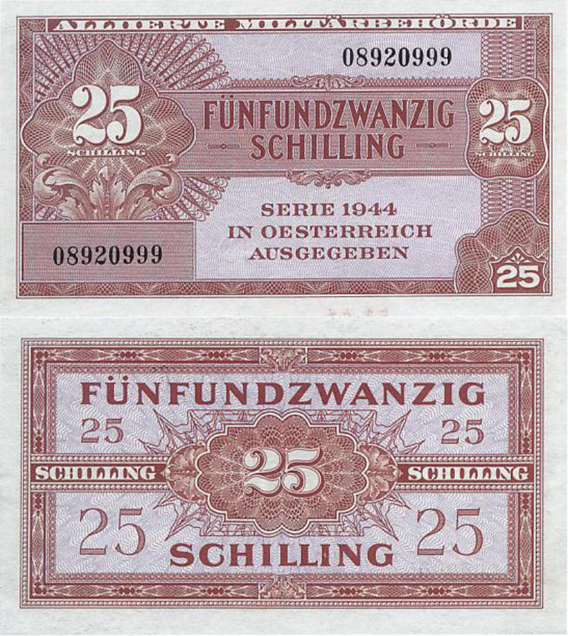 25 Schilling; 1944; Pick 108; KN 8-stellig; Vs.: Ornamente und Wertangebe; Rs.: Ornamente und Rahmen; Wz.: Wellenlinien; erst im Mai 1945 ausgegeben; US-Druck |