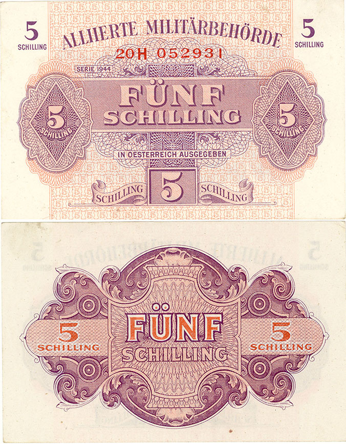 5 Schilling; 1944; Pick 105; KN 6-stellig; Vs.: Ornamente und Wertangebe; Rs.: Ornamente und Rahmen; Wz.: Wellenlinien; erst im Mai 1945 ausgegeben; US-Druck |