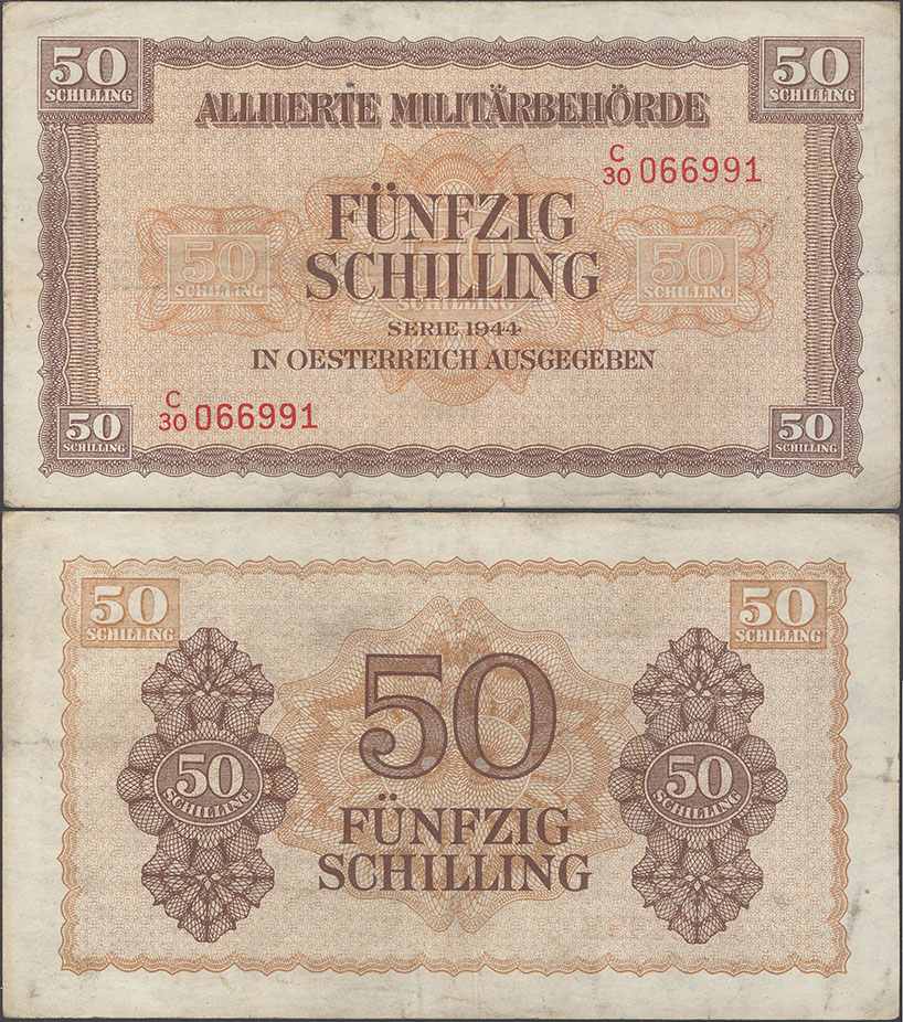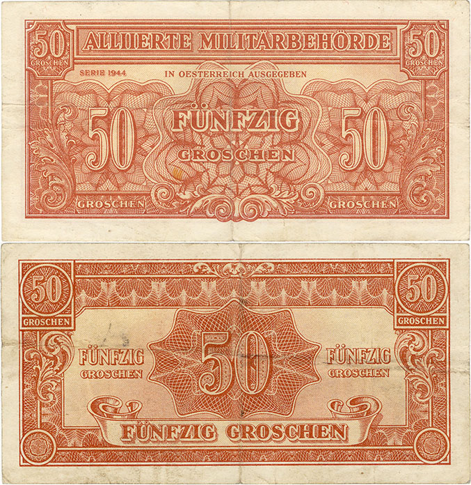 50 Groschen; 1944; Pick 102a; ohne KN; Vs.: Ornamente und Wertangebe; Rs.: Ornamente und Rahmen; Wz.: "Military Authority" oder ohne Wz.; erst im Mai 1945 ausgegeben; US-Druck |