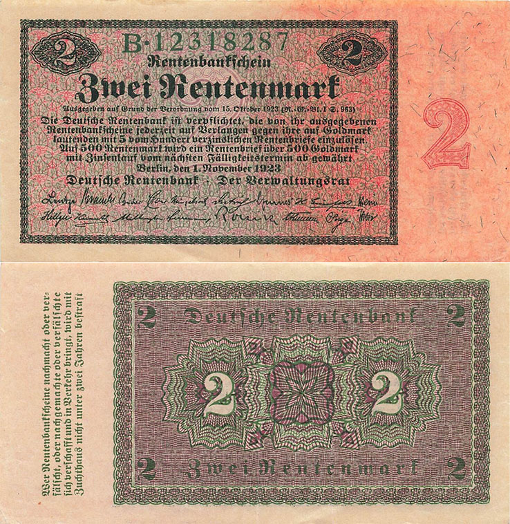 2 Rentenmark; 1.11.1923; Grabowski DEU-200 (155/P162); Vs.: Text im Rahmen auf Udr. mit Wertzahl; Rs.: Wert auf Ornamenten; Wz.: Kreuzringelmuster; KN 8-stellig, grün |
