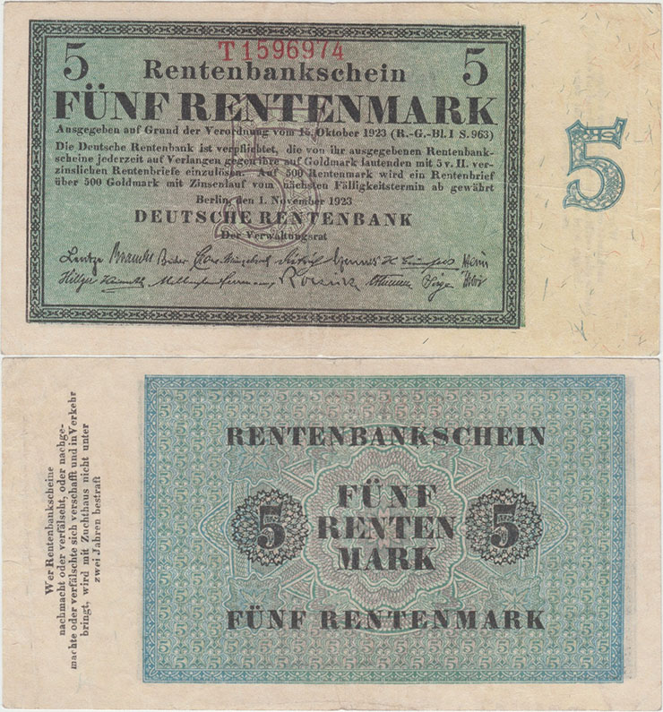 5 Rentenmark; 1.11.1923; Grabowski DEU-201 (156/P163); Vs.: Text im Rahmen auf Udr. mit Wertzahl; Rs.: Wert auf Ornamenten; Wz.: Kreuzringelmuster; KN rot |