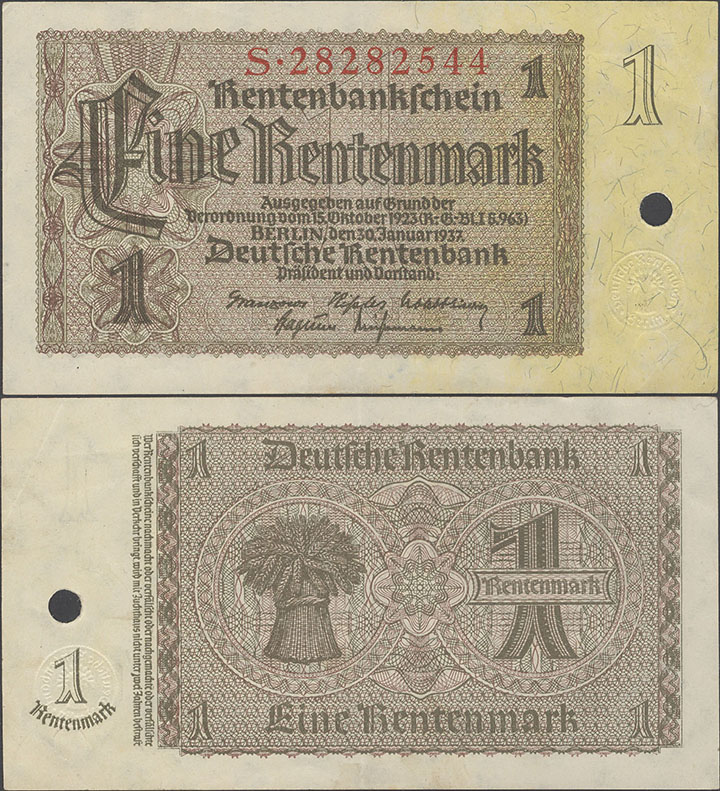 1 Rentenmark; 30.1.1937 (erst ab 5.9.1939 ausgegeben); nicht katalogisiert; Vs.: Text auf Ornamenten mit Wertzahl; Rs.: Ährengarbe und Wertangabe in Ornamenten; Wz.: Kleinkaro (Karos und Ringe); Kn 8-stellig, rot; lochentwertet; Reichsdruckerei |
