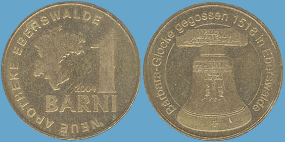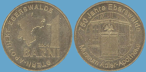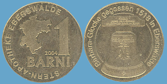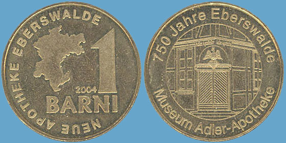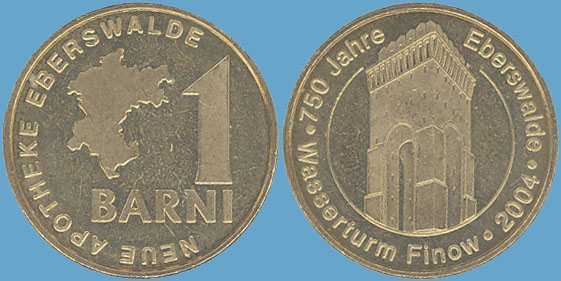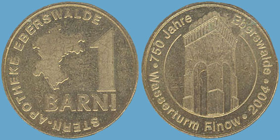 1 Barni; 2004; ausgegeben: 2004/09; Herausgeber: Stern-Apotheke Eberswalde; MB-1Barni-2004-06; Vs.: 1 BARNI - STERN-APOTHEKE EBERRSWALDE; Rs.: 750 Jahre Eberswalde • Wasserturm Finow - 2004; Nordig-Gold; Dm=23,5mm; Zeichnung: n.h.s. |