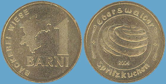 1 Barni; 2004; ausgegeben: 2004/05; Herausgeber: Bäckerei Wiese; MB-1Barni-2004-03; Vs.: 1 BARNI - Bäckerei Wiese; Rs.: Eberswalder Spritzkuchen; Nordig-Gold; Dm=23,5mm; Zeichnung: n.h.s. |