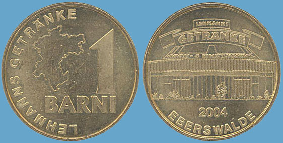 1 Barni; 2004; ausgegeben: 2004/08; Herausgeber: Lehmanns Getränke; MB-1Barni-2004-04; Vs.: 1 BARNI - Lehmanns Getränke; Rs.: Geschäft Lehmanns Getränke; Nordig-Gold; Dm=23,5mm; Zeichnung: n.h.s. |