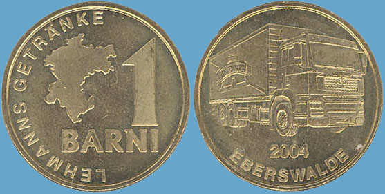 1 Barni; 2004; ausgegeben: 2004/09; Herausgeber: Lehmanns Getränke; MB-1Barni-2004-05; Vs.: 1 BARNI - Lehmanns Getränke; Rs.: LKW Lehmanns Getränke; Nordig-Gold; Dm=23,5mm; Zeichnung: n.h.s. |