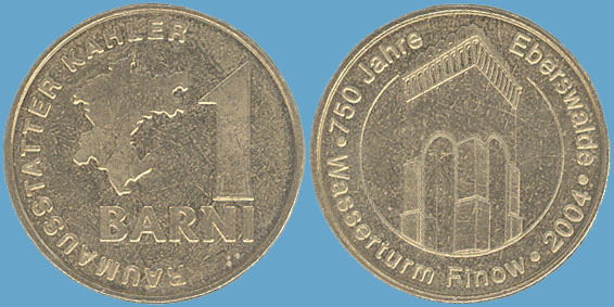 1 Barni; 2004; ausgegeben: 2004/09; Herausgeber: Raumausstatter Kahler; MB-1Barni-2004-08; Vs.: 1 BARNI - RAUMAUSSTATTER KAHLER; Rs.: 750 Jahre Eberswalde • Wasserturm Finow - 2004; Nordig-Gold; Dm=23,5mm; Zeichnung: n.h.s. |