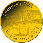 1 Barni; 2004; ausgegeben: 2004/10; Herausgeber: Juwelier & Goldschmiede Lanowski; MB-1Barni-2004-09; Vs.: 1 BARNI - Juwelier & Goldschmiede Lanowski; Rs.: Eisenbahnbrücke Eberswalde 1910; Nordig-Gold; Dm=23,5mm; Zeichnung: n.h.s. |