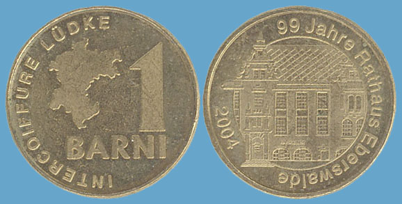 1 Barni; 2004; ausgegeben: 2004/10; Herausgeber: Intercoiffure Lüdke; MB-1Barni-2004-12; Vs.: 1 BARNI - Intercoiffure Lüdke; Rs.: 99 Jahre Rathaus Eberswalde; Nordig-Gold; Dm=23,5mm; Zeichnung: Klaus Musahl |