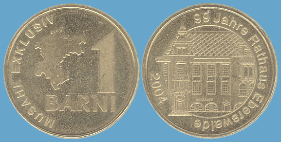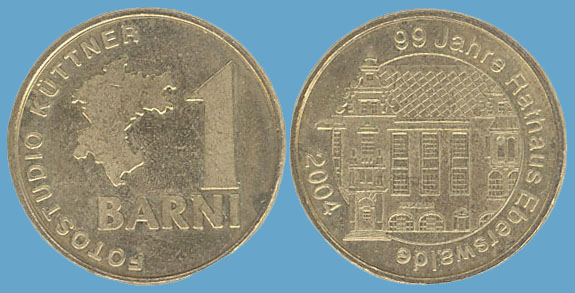 1 Barni; 2004; ausgegeben: 2004/10; Herausgeber: Fotostudio Küttner; MB-1Barni-2004-13; Vs.: 1 BARNI - Fotostudio Küttner; Rs.: 99 Jahre Rathaus Eberswalde; Nordig-Gold; Dm=23,5mm; Zeichnung: Klaus Musahl |
