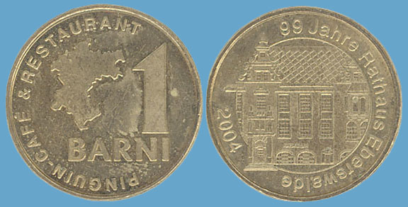 1 Barni; 2004; ausgegeben: 2004/10; Herausgeber: Pinguin-Cafe & Restaurant; MB-1Barni-2004-15; Vs.: 1 BARNI - Pinguin-Cafe & Restaurant; Rs.: 99 Jahre Rathaus Eberswalde; Nordig-Gold; Dm=23,5mm; Zeichnung: Klaus Musahl |