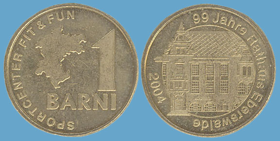 1 Barni; 2004; ausgegeben: 2004/10; Herausgeber: Fit & Fun; MB-1Barni-2004-16; Vs.: 1 BARNI - Fit & Fun; Rs.: 99 Jahre Rathaus Eberswalde; Nordig-Gold; Dm=23,5mm; Zeichnung: Klaus Musahl |