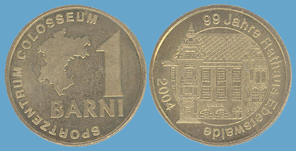 1 Barni; 2004; ausgegeben: 2004/10; Herausgeber: Sportzentrum Colosseum; MB-1Barni-2004-17; Vs.: 1 BARNI - Sportzentrum Colosseum; Rs.: 99 Jahre Rathaus Eberswalde; Nordig-Gold; Dm=23,5mm; Zeichnung: Klaus Musahl |