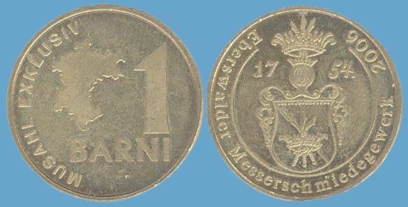 1 Barni; 2006; ausgegeben: 2006/01; Herausgeber: Musahl exklusiv; MB-1Barni-2006-01; Vs.: 1 BARNI - Musahl exklusiv; Rs.: Eberswalder Messerschmiedegewerk 1754; Nordig-Gold; Dm=23,5mm; Zeichnung: Klaus Musahl |
