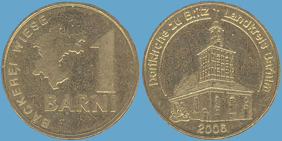 1 Barni; 2006; ausgegeben: 2006/01; Herausgeber: Bäckerei Wiese; MB-1Barni-2006-02; Vs.: 1 BARNI - Bäckerei Wiese; Rs.: Dorfkirche zu Britz Landkreis Barnim 2006; Nordig-Gold; Dm=23,5mm |