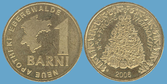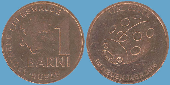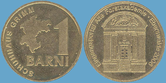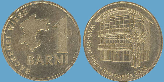 1 Barni; 2006; ausgegeben: 2006/06; Herausgeber: Bäckerei Wiese; MB-1Barni-2006-21; Vs.: 1 BARNI - Bäckerei Wiese; Rs.: Wald-Solarheim Eberswalde; Nordig-Gold; Dm=23,5mm |