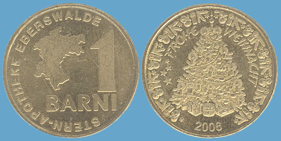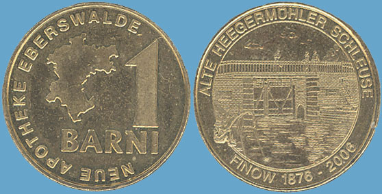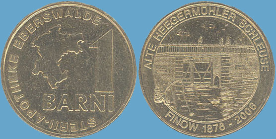 1 Barni; 2006; ausgegeben: 2006/03; Herausgeber: Stern-Apotheke Eberswalde; MB-1Barni-2006-09; Vs.: 1 BARNI - STERN-APOTHEKE EBERRSWALDE; Rs.: ALTE HEEGERMÜHLER SCHLEUSE FINOW 1876 - 2006; Nordig-Gold; Dm=23,5mm |