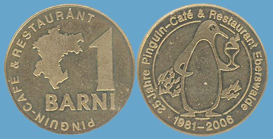 1 Barni; 2006; ausgegeben: 2006/03; Herausgeber: Pinguin-Cafe & Restaurant; MB-1Barni-2006-12; Vs.: 1 BARNI - Pinguin-Cafe & Restaurant; Rs.: 25 Jahre Pinguin-Cafe & Restaurant Eberswalde 1981-2006; Nordig-Gold; Dm=23,5mm |