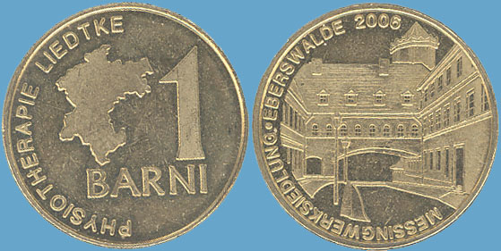 1 Barni; 2006; ausgegeben: 2006/04; Herausgeber: Physiotherapie & Podologie S. Liedtke; MB-1Barni-2006-13; Vs.: 1 BARNI - PHYSIOTHERAPIE LIEDTKE; Rs.: MESSINGWERKSIEDLUNG • EBERSWALDE 2006; Nordig-Gold; Dm=23,5mm |