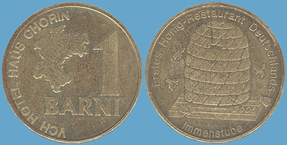 1 Barni; 2006; ausgegeben: 2006/04; Herausgeber: VCH HOTEL HAUS CHORIN; MB-1Barni-2006-15; Vs.: 1 BARNI - VCH HOTEL HAUS CHORIN; Rs.: Erstes Honigrestaurant Deutschlands Immenstube - 2006; Nordig-Gold; Dm=23,5mm |