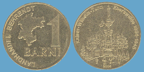 1 Barni; 2006; ausgegeben: 2006/04; Herausgeber: Landhandel Behrendt; MB-1Barni-2006-16; Vs.: 1 BARNI - Landhandel Behrendt; Rs.: Kaiser-Wilhelm-Turm Eberswalde 1896-1945; Nordig-Gold; Dm=23,5mm |