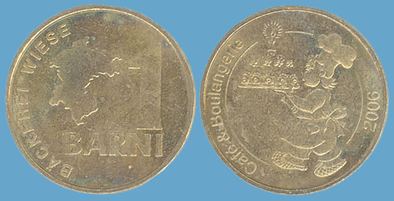 1 Barni; 2006; ausgegeben: 2006/05; Herausgeber: Bäckerei Wiese; MB-1Barni-2006-17; Vs.: 1 BARNI - Bäckerei Wiese; Rs.: Cafe & Boulangerie (Bäcker mit Torte); Nordig-Gold; Dm=23,5mm |