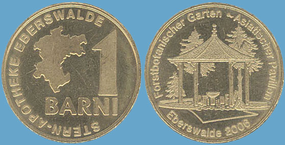 1 Barni; 2006; ausgegeben: 2006/06; Herausgeber: Stern-Apotheke; MB-1Barni-2006-22; Vs.: 1 BARNI - Stern-Apotheke; Rs.: Forstbotanischer Garten Eberswalde, Asiatischer pavillion; Nordig-Gold; Dm=23,5mm |