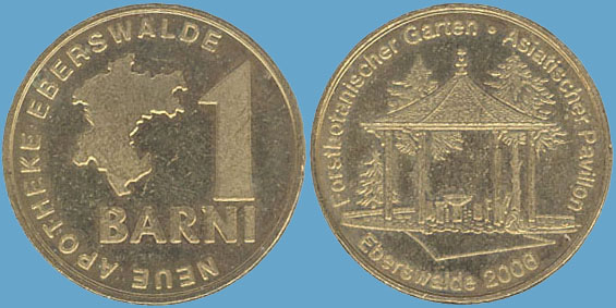 1 Barni; 2006; ausgegeben: 2006/06; Herausgeber: Neue Apotheke; MB-1Barni-2006-23; Vs.: 1 BARNI - Neue Apotheke; Rs.: Forstbotanischer Garten Eberswalde, Asiatischer pavillion; Nordig-Gold; Dm=23,5mm |