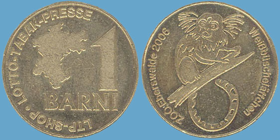 1 Barni; 2006; ausgegeben: 2006/06; Herausgeber: LTP-Shop Lotto Taback Presse; MB-1Barni-2006-24; Vs.: 1 BARNI - LTP-Shop Lotto Taback Presse; Rs.: ZOO Eberswalde, Weißbüscheläffchen; Nordig-Gold; Dm=23,5mm |