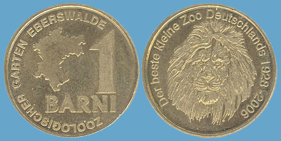 1 Barni; 2006; ausgegeben: 2006/06; Herausgeber: ZOO Eberswalde; MB-1Barni-2006-25; Vs.: 1 BARNI - ZOO Eberswalde; Rs.: Der beste kleine ZOO Deutschlands; Nordig-Gold; Dm=23,5mm |