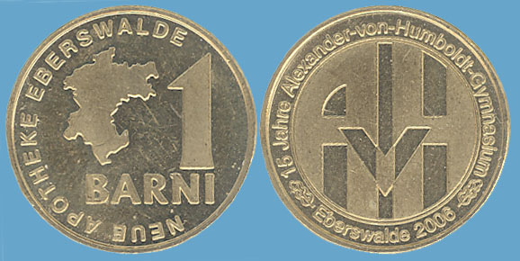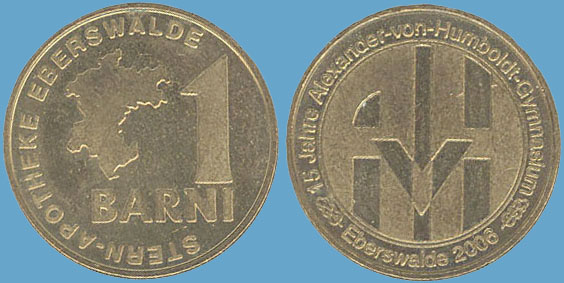 1 Barni; 2006; ausgegeben: 2006/09; Herausgeber: Neue Apotheke; MB-1Barni-2006-29; Vs.: 1 BARNI - Neue Apotheke; Rs.: 15 Jahre Alexander-von-Humbold-Gymnasium; Nordig-Gold; Dm=23,5mm |