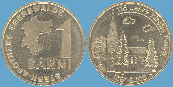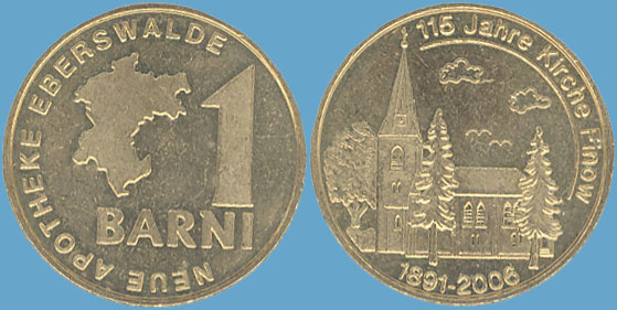 1 Barni; 2006; ausgegeben: 2006/10; Herausgeber: Neue Apotheke Eberswalde; MB-1Barni-2006-32; Vs.: 1 BARNI - NEUE APOTHEKE EBERRSWALDE; Rs.: 115 Jahre Kirche Finow 1891-2006; Nordig-Gold; Dm=23,5mm |