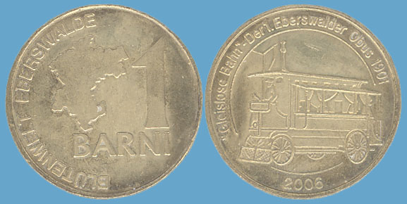 1 Barni; 2006; ausgegeben: 2006/12; Herausgeber: Blütenwelt Eberswalde; MB-1Barni-2006-40; Vs.: 1 BARNI - Blütenwelt Eberswalde; Rs.: Gleislose Bahn-Der 1. Eberswalder Obus 1901; Nordig-Gold; Dm=23,5mm |