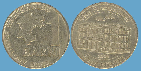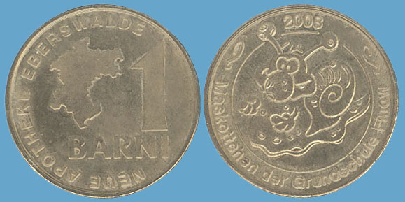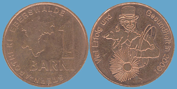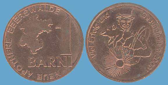 1 Barni; 2009; ausgegeben: 2009/01; Herausgeber: Neue Apotheke Eberswalde; MB-1Barni-2009-05; Vs.: 1 BARNI - NEUE APOTHEKE EBERRSWALDE; Rs.: Maskottchen der Grundschule Finow - 2009; Stahlkern vermessingt; Dm=23,5mm |
