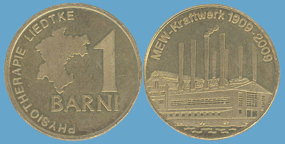 1 Barni; 2009; ausgegeben: 2009/02; Herausgeber: Physiotherapie & Podologie S. Liedtke; MB-1Barni-2009-06; Vs.: 1 BARNI - Physiotherapie & Podologie S. Liedtke; Rs.: MEW-Kraftwerk 1909-2009; Stahlkern vermessingt; Dm=23,5mm |