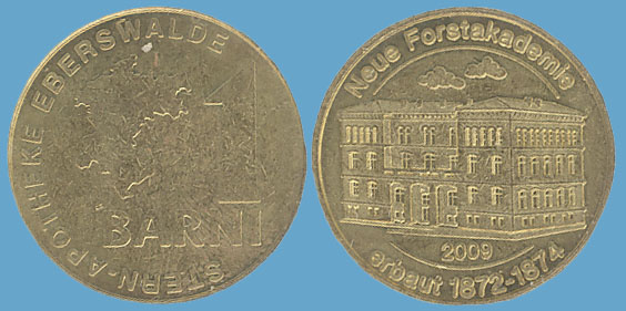 1 Barni; 2009; ausgegeben: 2009/04; Herausgeber: Stern-Apotheke; MB-1Barni-2009-08; Vs.: 1 BARNI - Stern-Apotheke; Rs.: Neue Forstakademie; Stahlkern vermessingt; Dm=23,5mm |