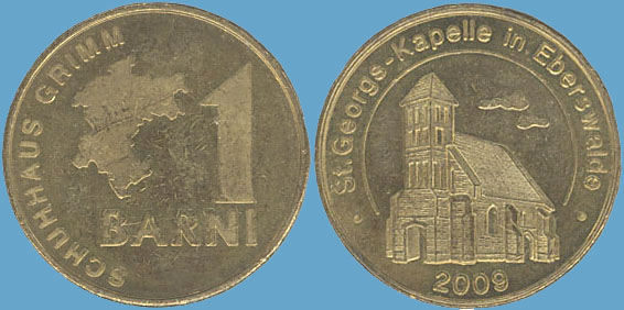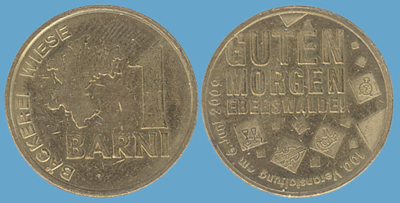 1 Barni; 2009; ausgegeben: 2009/12; Herausgeber: Juwelier & Goldschmiede Lanowski; MB-1Barni-2009-32; Vs.: 1 BARNI - Juwelier & Goldschmiede Lanowski; Rs.: Postgebäude Eberswalde-erbaut 1890-92; Stahlkern vermessingt; Dm=23,5mm |
