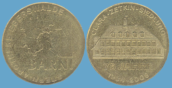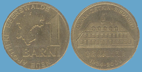 1 Barni; 2009; ausgegeben: 2009/07; Herausgeber: Stern-Apotheke; MB-1Barni-2009-20; Vs.: 1 BARNI - Stern-Apotheke; Rs.: 75 Jahre Clara-Zetkin-Siedlung; Stahlkern vermessingt; Dm=23,5mm |