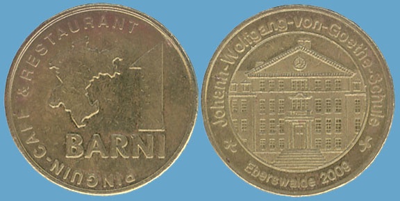 1 Barni; 2009; ausgegeben: 2009/07; Herausgeber: Pinguin-Cafe & Restaurant; MB-1Barni-2009-23; Vs.: 1 BARNI - Pinguin-Cafe & Restaurant; Rs.: Johann-Wolfgang-von-Goethe-Schule; Stahlkern vermessingt; Dm=23,5mm |