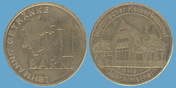 1 Barni; 2009; ausgegeben: 2009/09; Herausgeber: Lehmanns Getränke; MB-1Barni-2009-26; Vs.: 1 BARNI - Lehmanns Getränke; Rs.: Historischer Kaiserbahnhof Joachimsthal; Stahlkern vermessingt; Dm=23,5mm |