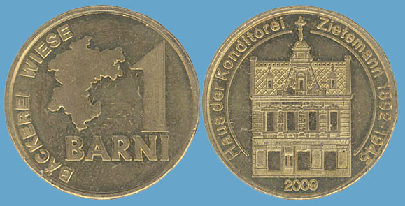 1 Barni; 2009; ausgegeben: 2009/09; Herausgeber: Bäckerei Wiese; MB-1Barni-2009-27; Vs.: 1 BARNI - Bäckerei Wiese; Rs.: Haus der Konditorei Ziethemann 1892-1945; Stahlkern vermessingt; Dm=23,5mm |