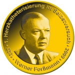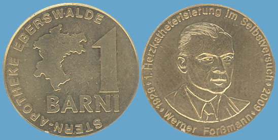 1 Barni; 2009; ausgegeben: 2009/10; Herausgeber: Stern-Apotheke; MB-1Barni-2009-29; Vs.: 1 BARNI - Stern-Apotheke; Rs.: Werner Forßmann: Erste Herzkatheterisierung im Selbstversuch 1929; Stahlkern vermessingt; Dm=23,5mm |