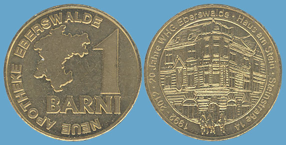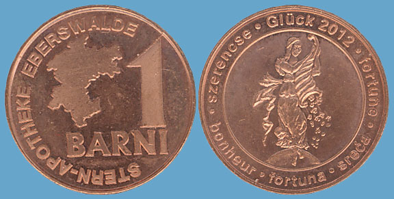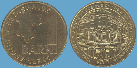 1 Barni; 2012; ausgegeben: 2012/06; Herausgeber: Stern-Apotheke; MB-1Barni-2012-14; Vs.: 1 BARNI - Stern-Apotheke; Rs.: 20 Jahre WHG Eberswalde – Haus am Stein, Steinstr. 14; Stahlkern vermessingt; Dm=23,5mm |